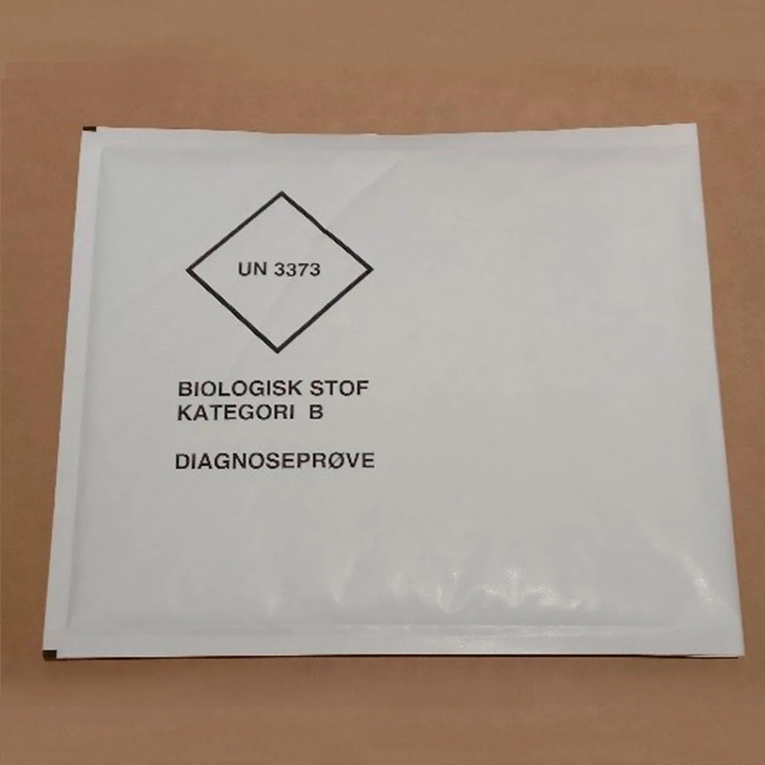 Alla kuverten är märkta enligt ADR-reglerna, en romb i formatet 50×50 mms storlek med texten ”UN 3373” invändigt. Under finns texten ”BIOLOGISKT MATERIAL – kategori B”.